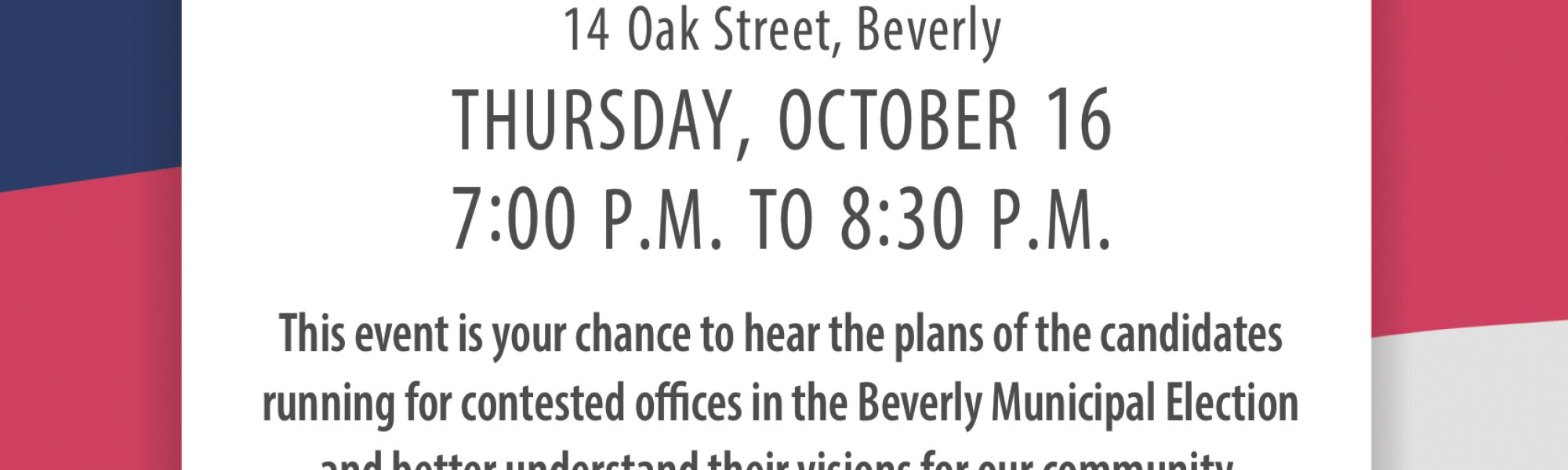 This event is your chance to hear the plans of the candidates running for contested offices in the Beverly Municipal Election and better understand their visions for our community.