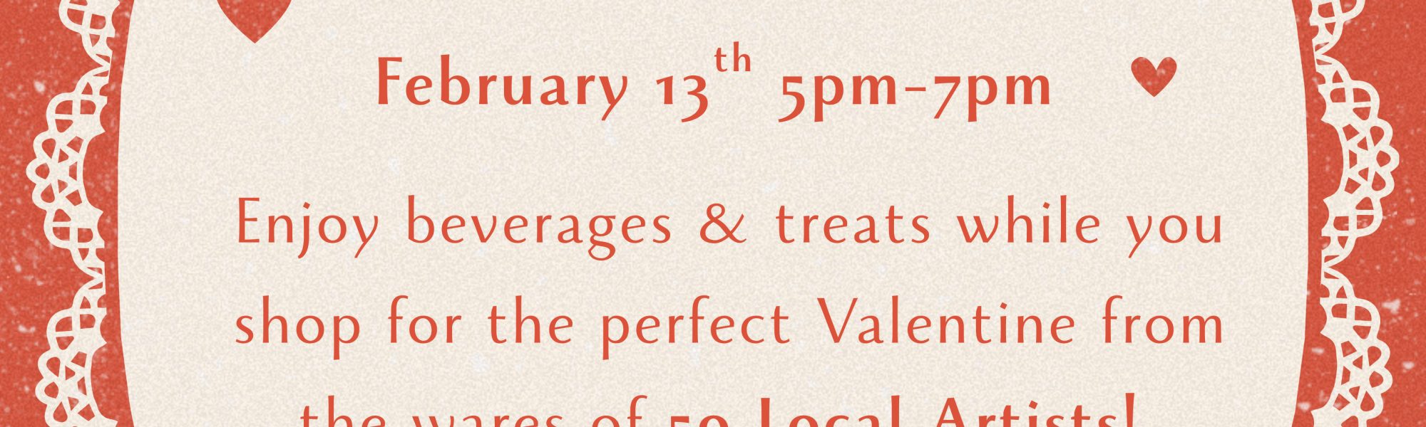 Enjoy beverages & treats while you shop for the perfect Valentine from the wares of 50 Local Artists! We will also be hosting Love & Clay Designs for a Permanent Jewelry Pop-Up (10% Off 2+ Jewelry Pieces).