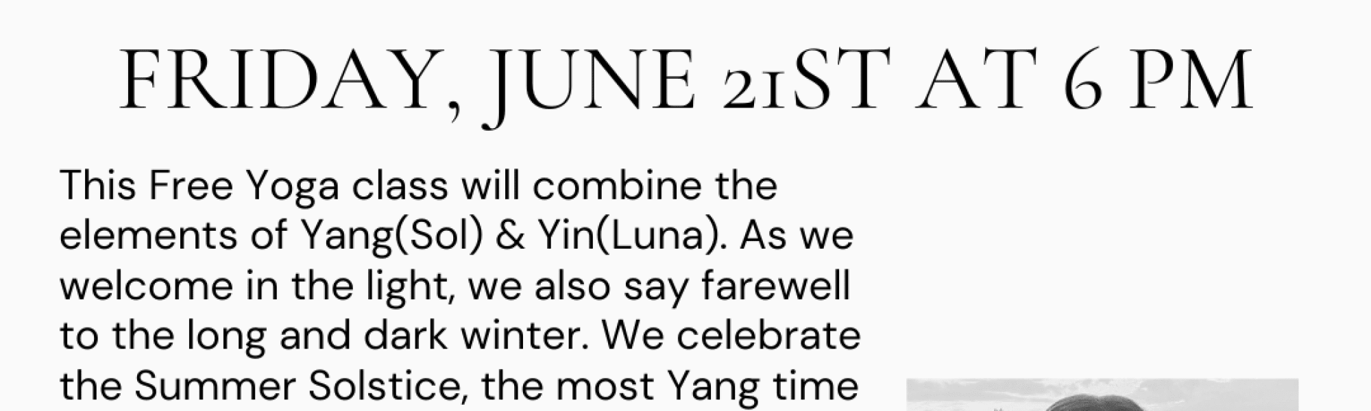 FreeFree Yoga Summer Solstice Celebration for all members of Purple Sun + Moon! This class will combine the elements of Yang (Sol) the yin season that has taught us so much in times of reflection. This practice will start with a Vinyasa flow, celebrating the sun and the outward expression of summer. We will finish in a yin practice that focuses on the fire element, and balancing the pitta or fire of the summer. The Yin practice creates inward energy and solitude. This balancing practice of the Yang and the Yin is for everyone!