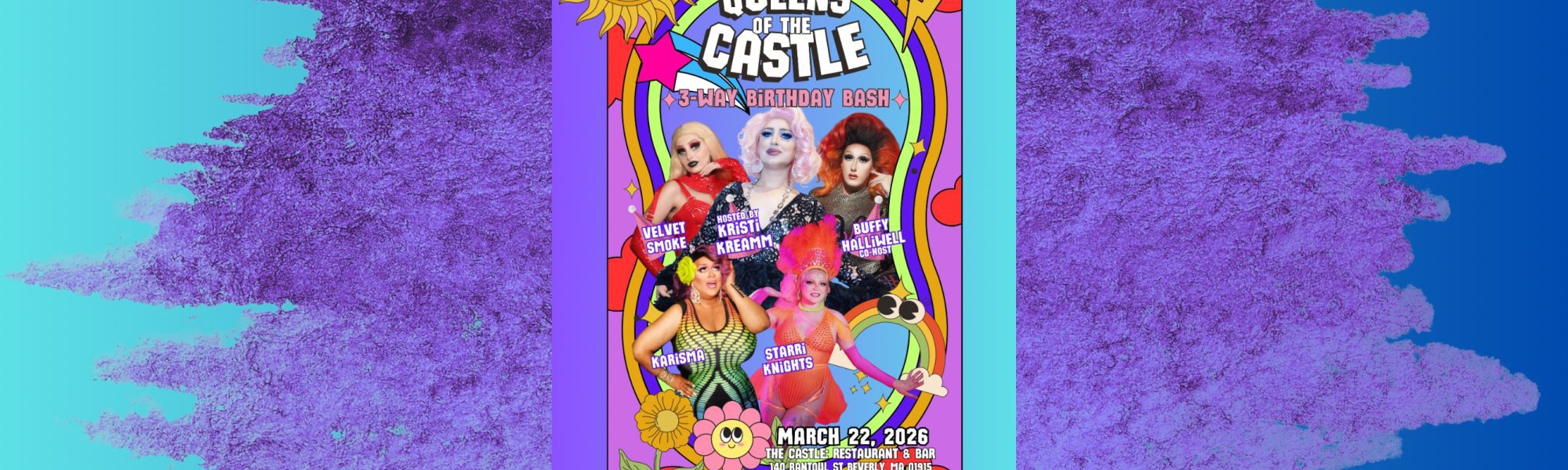 The comedic duo of Kristi Kreamm & Buffy Halliwell are hosting a fabulous drag show celebrating 3 Birthdays. Along With performances by Velvet Smoke , Karisma and Starri Knights at The Castle: Restaurant & Bar in Beverly . Come out and celebrate Kristi Kreamm , Buffy Halliwell & Velvet Smokes birthdays 🎈 for a night you won’t forget