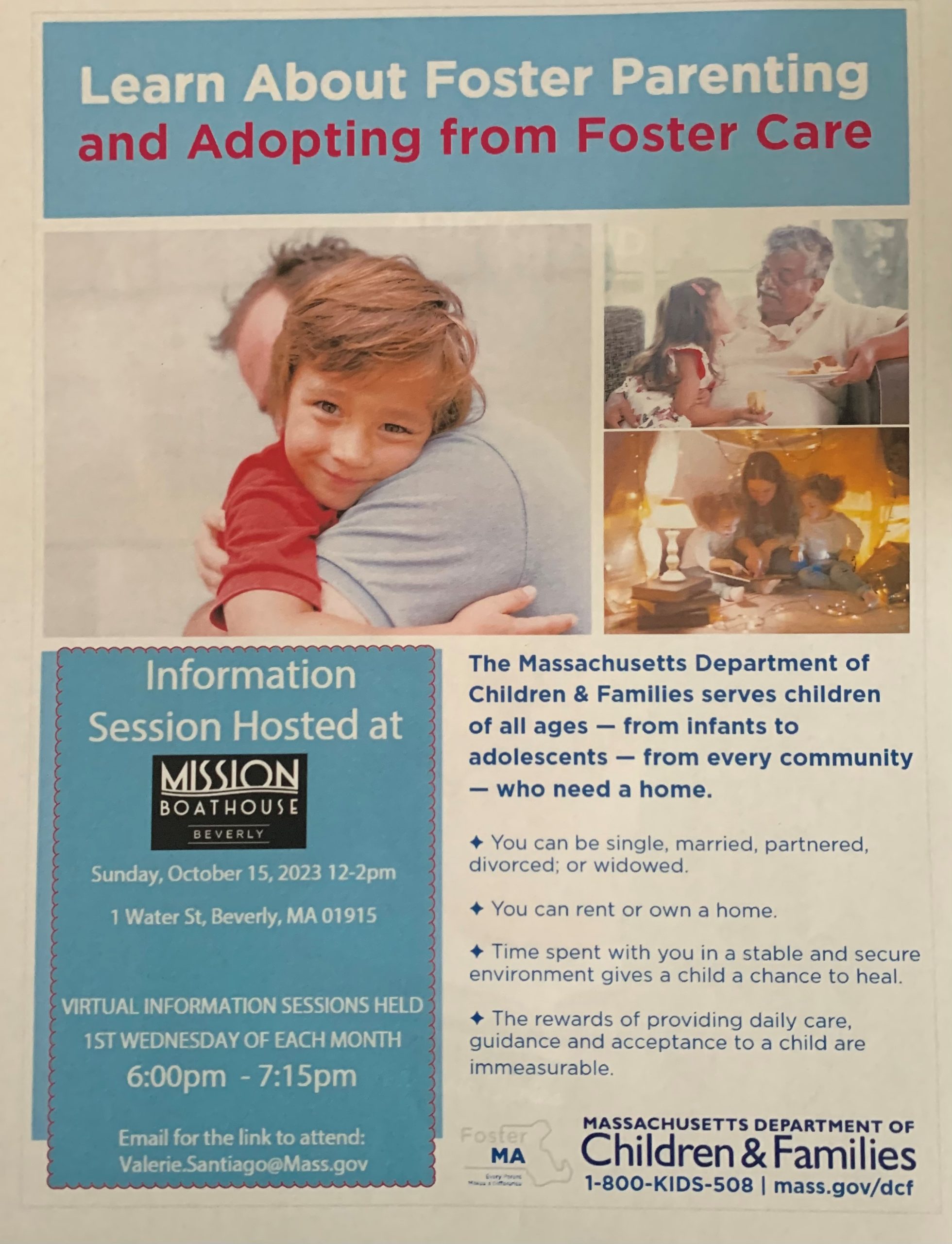Foster care provides a safe, loving home for children until they can be reunited with their families. We serve children of all ages from infants to adolescents from every community who need a home. There’s a need for foster parents across Massachusetts, from all diverse backgrounds. Event Details: Sunday, October 15th from 12-2pm Mission Boathouse,...