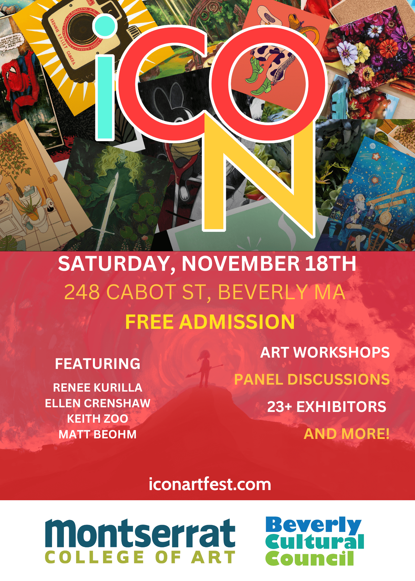 iCON is a free art exhibition and community event located in the creative epicenter of Beverly, Massachusetts. Highlighting the innovative strength of artists and their diverse backgrounds, iCON aims to bring people together to showcase, vend, and celebrate all creative identities in one location. Hosted by Montserrat College of Art and sponsored by the Beverly...