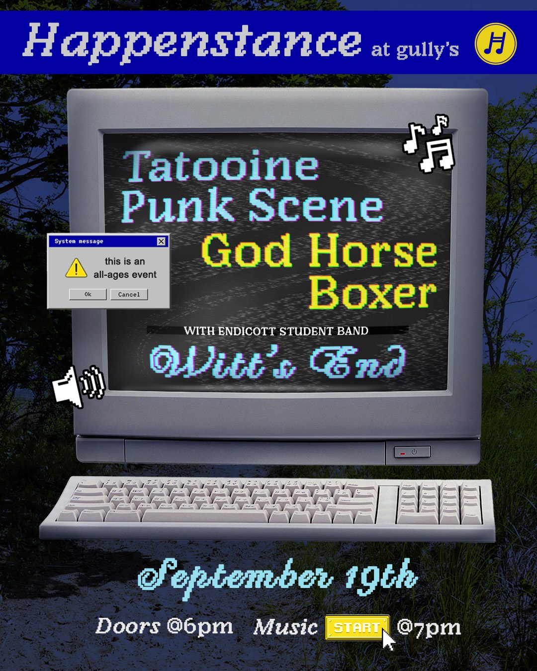 Catch Boston-based bands Tatooine Punk Scene and God Horse Boxer, plus Endicott student band Witt's End, at the next happenstance @ Gully's live music night on Endicott's campus. This is an all-ages show, with music starting at 7pm. $10 for the public, and "pay what you want/can" for students from other schools. 100% of the...