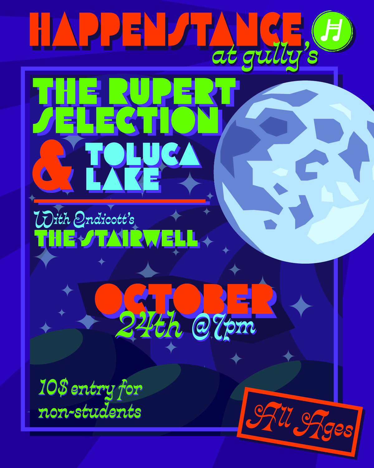 Come see Beverly's The Rupert Selection & Boston's Toluca Lake, plus Endicott's The Stairwell perform! $10 cover for the public, and "pay what you can" for students. Drink specials for 21+