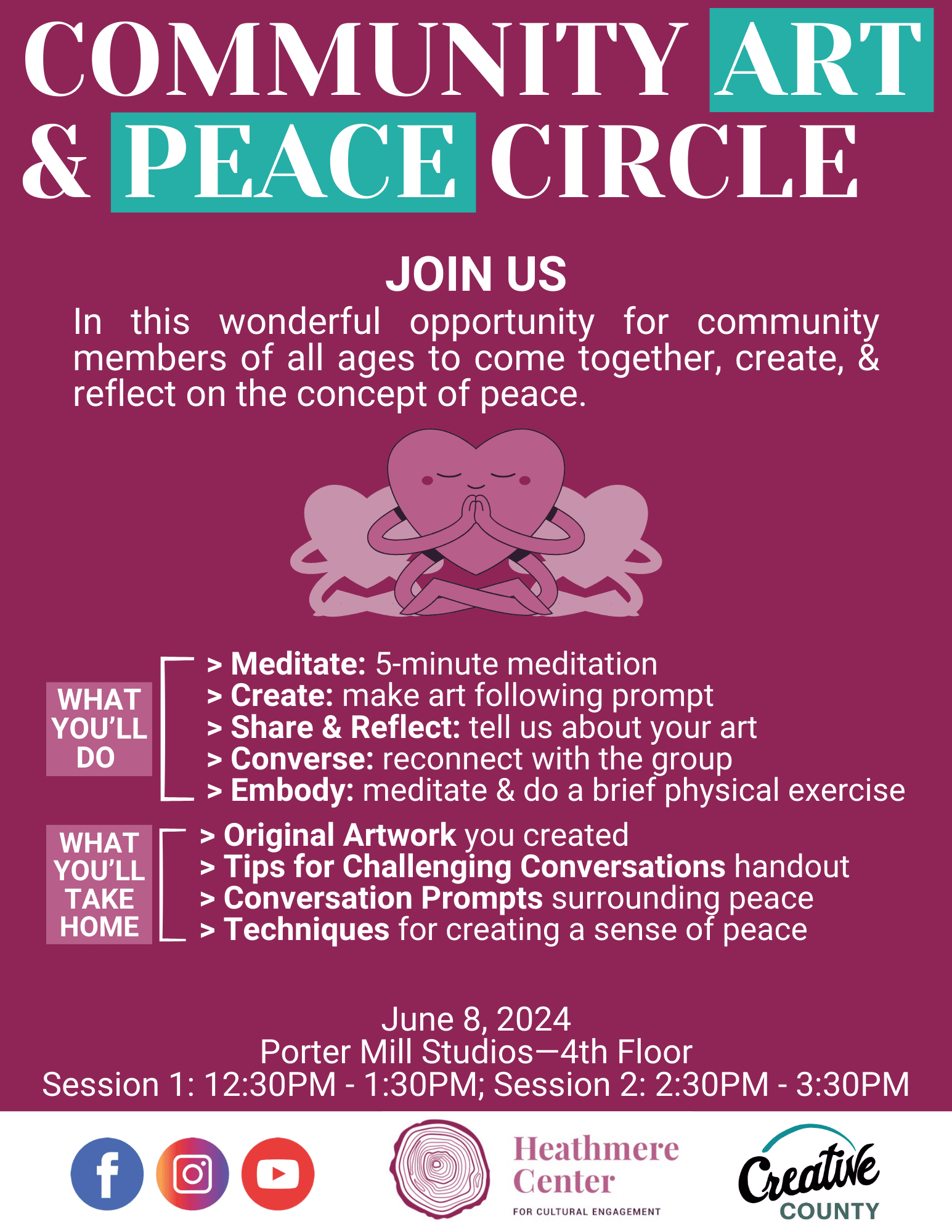 Studios at Porter Mill 95 Rantoul St , MA 01915 United States, Beverly, MA, United StatesAll are invited to Heathmere's free, family-friendly event: “Community Art and Peace Circle.” Local artist and educator, Luba Shapiro Grenader, will guide children, youth and adults in peace practices like meditation and dialogue, and engage them in making art about peace. We will hold these circles on the 4th floor of the Porter Mill Studios...