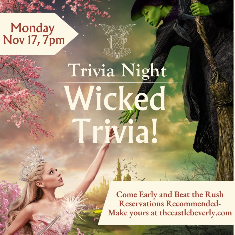 Join us for a night of Wicked themed trivia! Trivia will start at 7PM and reservations can be made at 6:30PM to grab a bite to eat!