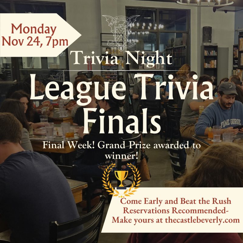Final week of our League Trivia! Trivia will start at 7PM and reservations can be made at 6:30PM to grab a bite to eat!