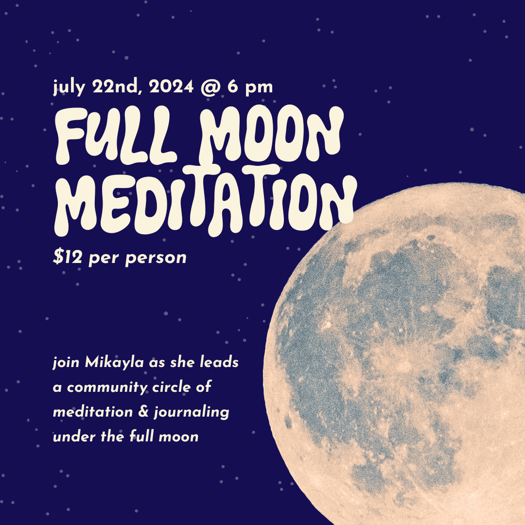 Monthly New Moon Meditation evenings with Mikayla! July 22nd, 2024 6 pm @ Soy Much Brighter (285 Rantoul St, Beverly) Join Mikayla as she leads a community circle of meditation and journaling under the full moon. Each meditation will be different depending on the what sign the moon is resting in, and the position of...